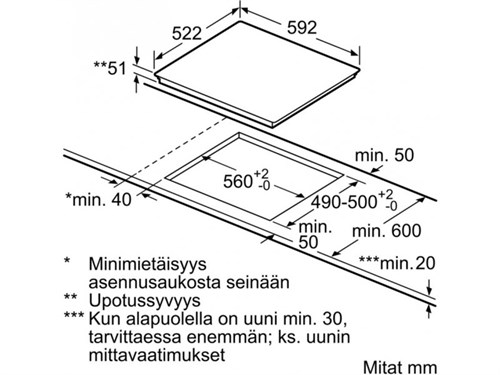 Kích thước lắp đặt (HxWxD mm): 51 x 560 x 490 - 500 mm