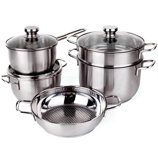 Bộ nồi gồm : 01 chảo Ø 24, 01 nồi Ø 24, 01 trõ hấp sôi Ø 24, 01 nồi 16cm, 01 nồi 20cm.