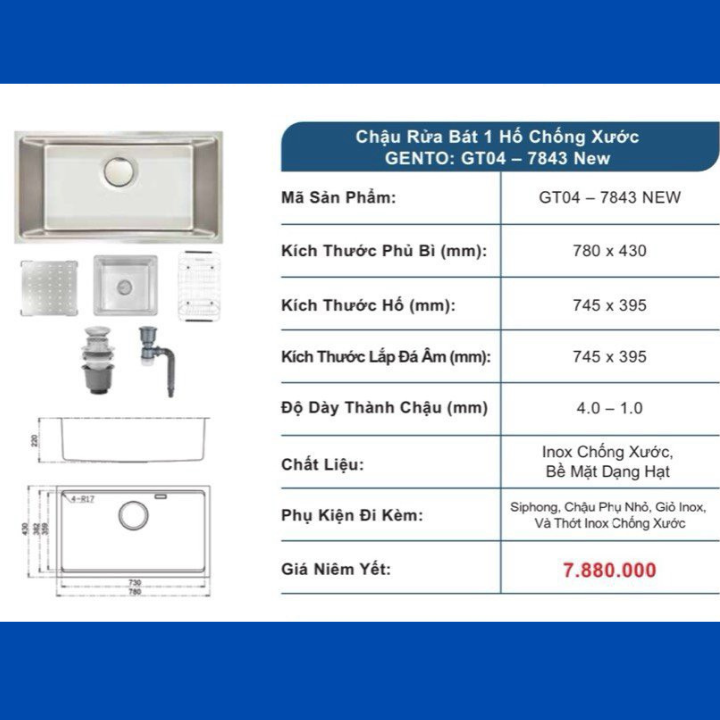 Nội thất An Phú Quý cam kết cung cấp chậu rửa bát 1 hố Gento GT04 – 7843 New chính hãng, giá tốt cùng dịch vụ lắp đặt tận nơi và bảo hành uy tín.