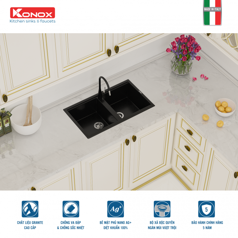 Chậu rửa bát đá Phoenix 860 Black nằm trong bộ sưu tập chậu vòi đá cao cấp của Konox – Kiệt tác Ý trong lòng bếp Việt