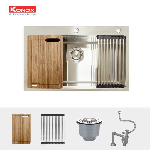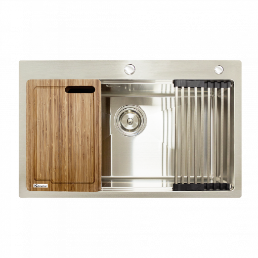 Chậu rửa bát Model KN8050TS với thiết kế 1 hố siêu rộng tích hợp phụ kiện đi kèm giúp tối ưu công năng, mang tới trải nghiệm tuyệt vời trong thao tác làm bếp. Với bề ngang 800mm, chậu thích hợp với khu vực bàn bếp có diện tích hộc tủ từ 800 trở lên.