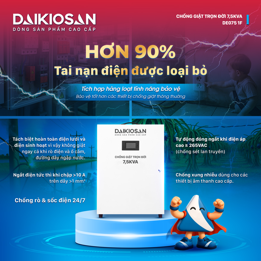 Chống giật trọn đời Daikiosan 10KVA DE100 1F – thiết bị chống giật trọn đời thế hệ mới – được xem là “lá chắn an toàn điện” hàng đầu hiện nay, ứng dụng công nghệ khung từ kín độc quyền giúp tách biệt hoàn toàn điện lưới, tạo ra nguồn điện không giật, không rò rỉ và vận hành ổn định tuyệt đối.