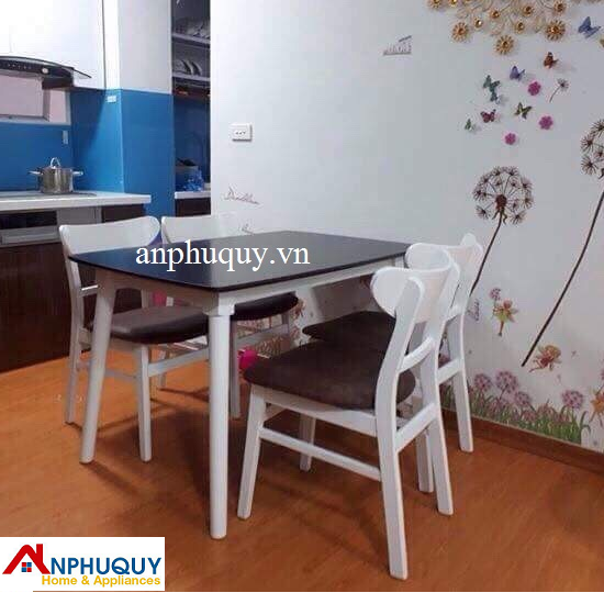 Thiết kế bộ bàn ăn 4 ghế giá rẻ phong cách hiện đại chất liệu gỗ cao su, những chiếc ghế bọc nệm với lưng tựa gỗ lan tỏa sự ấm áp, đơn giản cho phòng bếp. Trong thiết kế nội thất phòng căn chung cư đặc biệt là căn hộ có diện tích nhỏ thì một bàn ăn 4 ghế được sử dụng nhiều để tối ưu diện tích.
