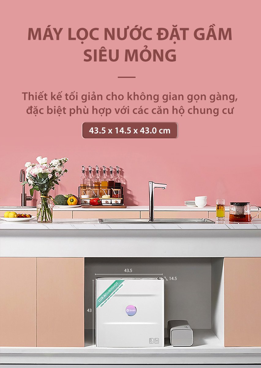 Máy lọc nước A. O. Smith ROSS™ LUX-AOU800HOT được thiết kế gọn gàng, tinh tế với kích thước chỉ 435 x 145 x 430 mm, dễ dàng lắp đặt dưới gầm tủ bếp hoặc các khu vực nhỏ hẹp.