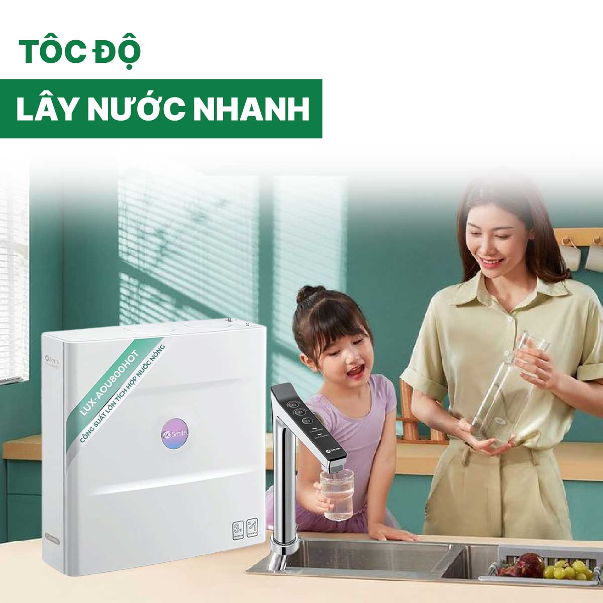 Với công suất lọc 800GPD (tương đương 2 lít/phút), máy đảm bảo nguồn nước sạch liên tục cho cả gia đình.