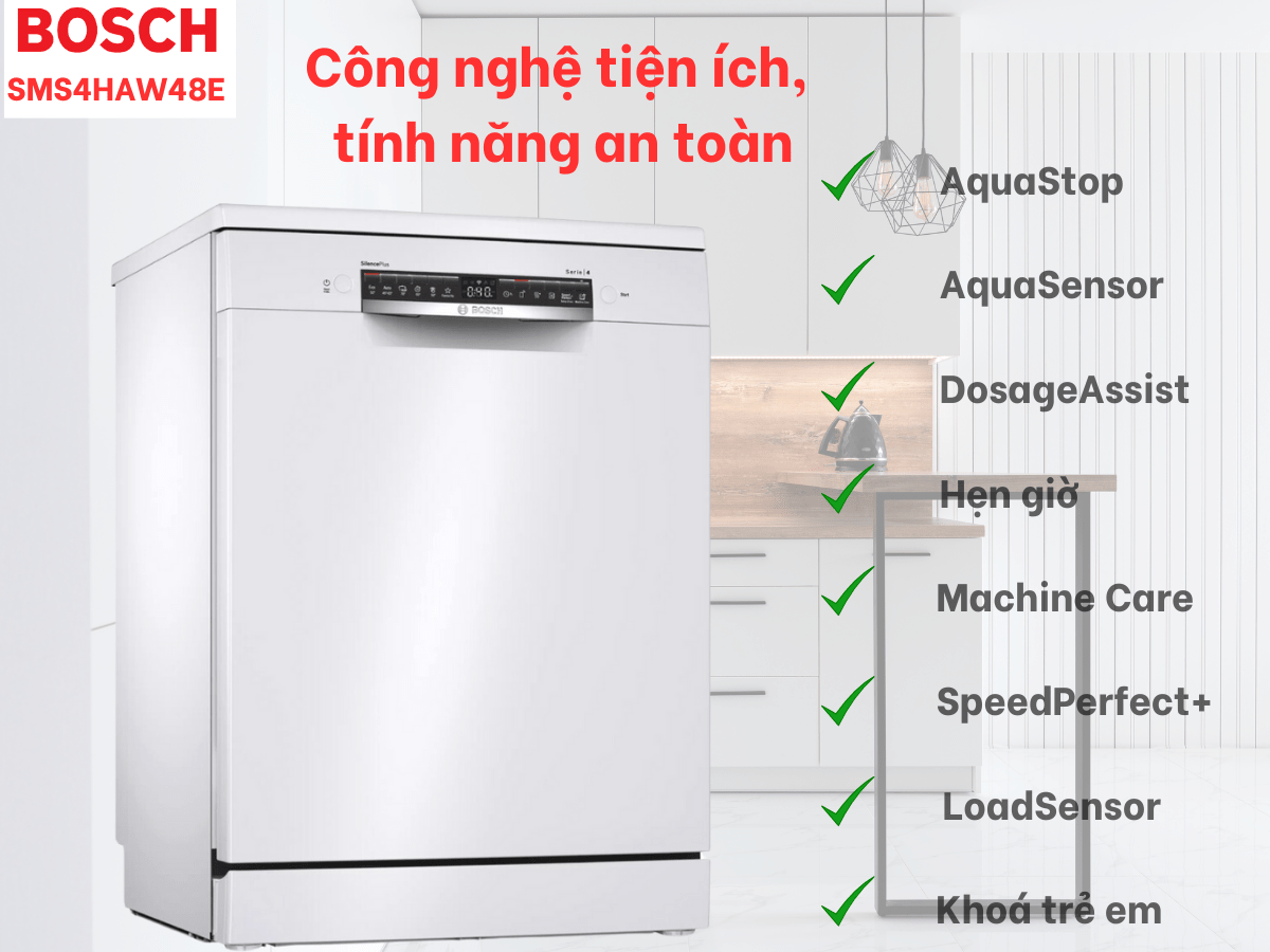 Máy rửa bát Bosch SMS4HAW48E Serie 4 là giải pháp hoàn hảo cho căn bếp hiện đại với khả năng rửa sạch vượt trội, tiết kiệm điện nước và vận hành êm ái. Nếu bạn đang tìm kiếm một chiếc máy rửa bát bền bỉ, thông minh và tiện nghi, đây chắc chắn là lựa chọn đáng đầu tư.