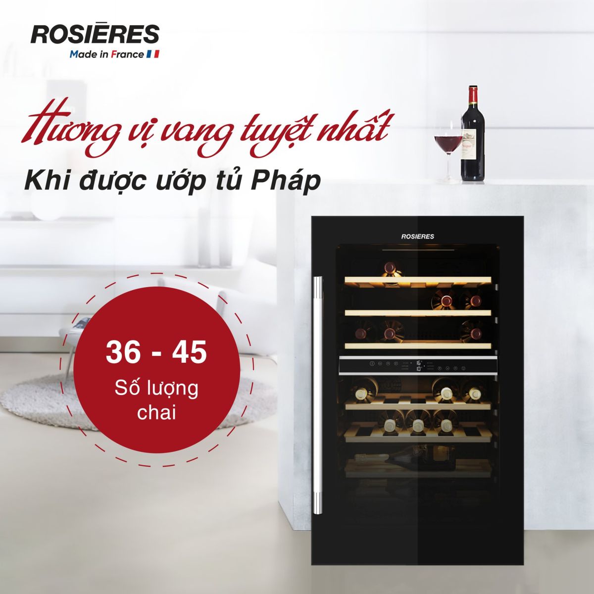 Tủ bảo quản rượu Rosieres RWC154DE với sức chứa 36 – 45 chai, thiết kế sang trọng, 2 vùng nhiệt độc lập, chống tia UV và hệ thống giá gỗ chống ẩm mốc sẽ giúp bạn giữ trọn hương vị nguyên bản của từng chai rượu.