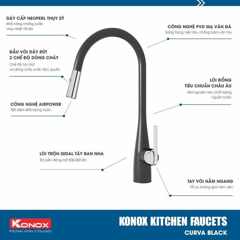 – Chức năng: Nóng lạnh + Rút dây + Đầu vòi khớp xoay + 2 chức năng Sprayer (Dòng chảy thắt eo, tạo bọt khí) + Xoay 360 độ